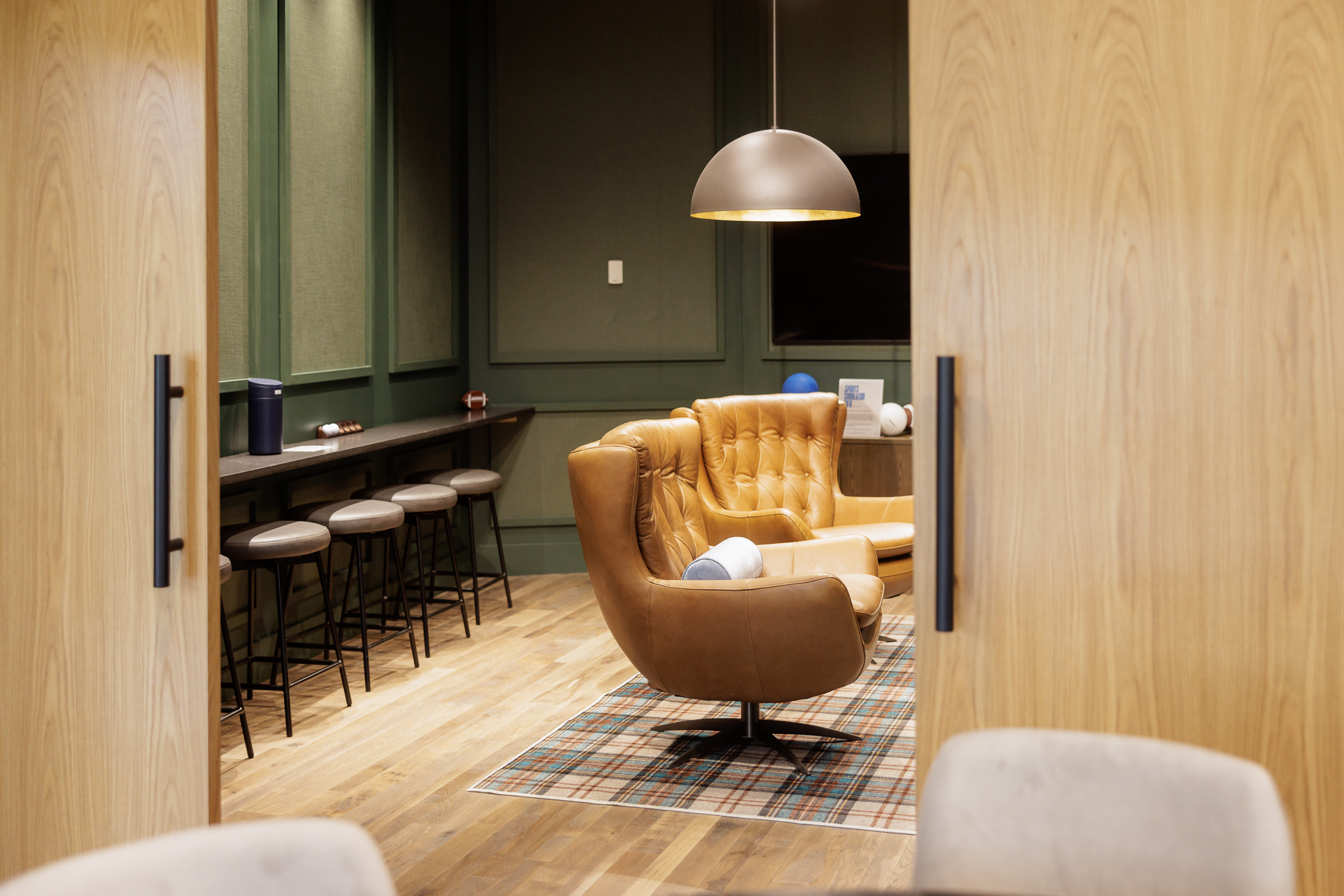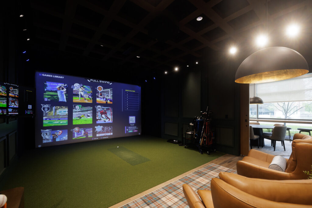 Unique to Waters Edge, this immersive lounge features a high-tech multisport simulator with golf, soccer, football, dodgeball, hockey, and more. Connected to the Newport, it’s perfect for reserving together when you want a balance of work and play.